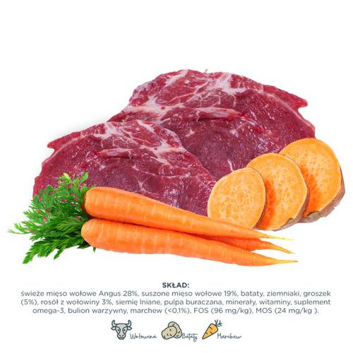 Skład: Wołowina 50% (w tym świeżo przygotowane mięso wołowe z bydła rasy Angus 28%, suszone mięso wołowe 19%, bulion wołowy 3%), bataty, ziemniaki, groszek (5%), siemię lniane, pulpa buraczana, minerały, witaminy, suplement omega-3, bulion warzywny, marchew (<0,1%), FOS (96 mg/kg), MOS (24 mg/kg ).