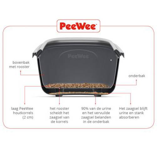 Prosty, bezpieczny i ekologiczny: system PeeWee dla kotów jest przyjazny środowisku i zapewnia Tobie i Twojemu pupilowi najwyższy poziom komfortu. Sprytna konstrukcja z podwójnym dnem składa się z dwóch mis, które są ułożone jedna na drugiej. Przez kratkę w górnej misie około 90% moczu przedostaje się do dolnego zbiornika. Reszta jest szybko wchłaniana przez naturalny drewniany żwirek, po czym rozkłada się na trociny. Podczas przekopywania ściółki trociny również przelatują przez otwory w górnej części dna misy, a łapy Twojego czworonoga pozostają suche i czyste.