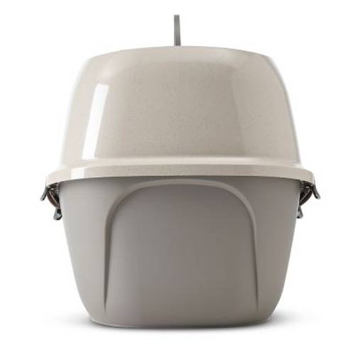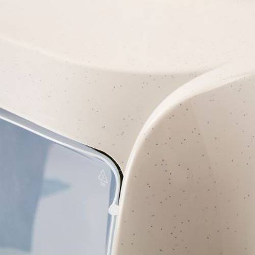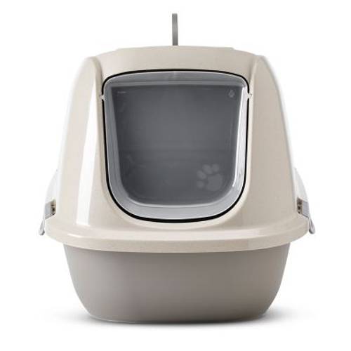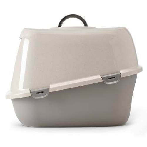 Przestronna, kryta kuweta dla kota, zapobiega wyciekaniu płynów, idealna dla zwierząt załatwiających się na stojąco, dużo miejsca do przegrzebywania ściółki, z węglem aktywnym, praktyczny uchwyt, z materiałów pochodzących z recyklingu