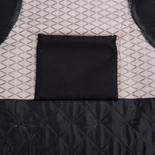 Kieszeń na przybory przymocowana z przodu pokrowca jest szczególnie praktyczna, można w niej przechowywać zabawki, smycz, worki na odchody itp. Specjalna nakładka umieszczona pomiędzy oparciem a siedziskiem oraz gumowany spód utrzymują matę na miejscu.