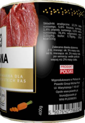 Zestaw 12 puszek Konina to źródło łatwo przyswajalnego białka, bogatego w witaminy z grupy B i fosfor. W składzie znajduje się aż 60% mięsa mięśniowego. Dodatek siemienia lnianego bogatego w kwasy Omega-3 pozytywnie wpłynie na lśniącą sierść. Siemię lniane obniża cholesterol, ciśnienie krwi, a t…