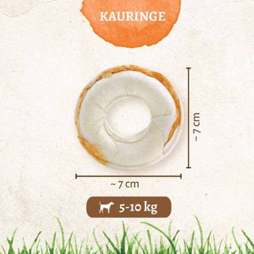 Pyszne kółeczka do żucia, dla psów ras średnich i dużych, mięso z kurczaka połączone ze skórą wołową, składniki wysokiej jakości, tylko 2,5% tłuszczu, bez sztucznych barwników i wzmacniaczy smaku