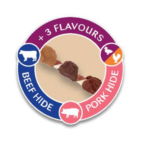Pałeczki do żucia dla psów od 2 do 35 kg, z kawałkami mięsa, skórą wieprzowo-wołową z filetem z kurczaka, piersią z kaczki i wątróbką drobiową, długa zabawa z żucia, przeciw kamieniowi nazębnemu i płytce nazębnej
