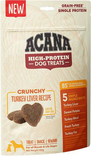 Przysmaki ACANA Treats Crunchy Turkey z indykiem są odpowiednie dla psów wszystkich ras i w każdym wieku. Idealnie sprawdzą się zarówno dla szczeniąt, jak i psich seniorów. Ponieważ zawierają wyłącznie jedno źródło białka, sprawdzą się także w nagradzaniu psów z wrażliwym układem trawiennym i alergiami pokarmowymi. Indyk jest lekkostrawny, a wątroba to wyjątkowo smakowite źródło białka, którą psy uwielbiają. W recepturze zawarto bogate w błonnik bataty, wspomagające trawienie i ogólny stan zdrowia jelit.