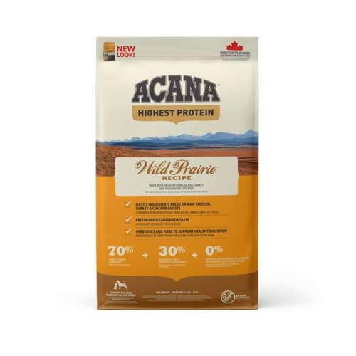Acana Regionals Wild Prairie zawiera kurczaka z wolnego wybiegu, indyka, całe jaja oraz ryby poławiane w naturalnym środowisku – wszystko w proporcjach WholePrey™ by odżywiać w sposób naturalny, bez sztucznych dodatków. składniki dostarczane są świeże lub surowe z regionu Alberty. Acana Regionals Wild Prairie ma ograniczoną zawartość węglowodanów, a przepełniona jest białkiem zwierzęcym, by zapewnić psu szczytową formę.