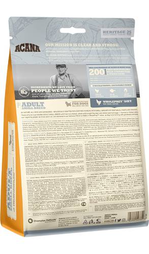 Acana Small Breed Adult Dog sucha karma dla dorosłych psów, małych ras. W jej składzie króluje mięso kurczaków z chowu bezklatkowego, jaja ściółkowe, mięso storni poławianej w naturalnym środowisku oraz dojrzewające w słońcu owoce i warzywa. Wszystko dostarczane jest świeże lub surowe z regionu Alberty, aby zapewnić wszystkie składniki odżywcze dla Twojego psa.