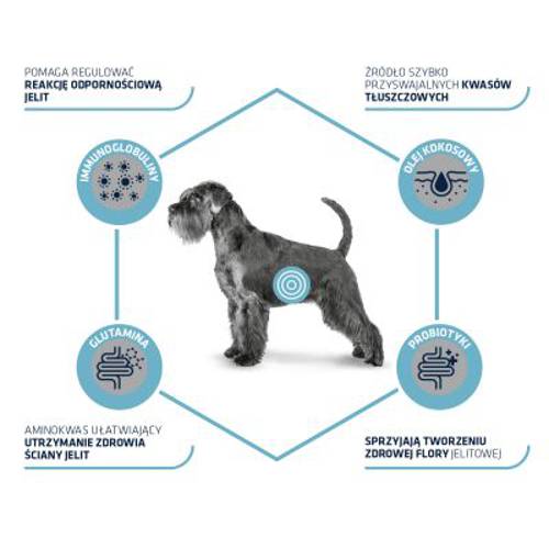 Karma o recepturze dopasowanej do dorosłych psów i szczeniąt cierpiących na zapalenie trzustki, zapalenie błony śluzowej żołądka, zapalenie jelit lub inne zapalne choroby jelit, prebiotyczna inulina
