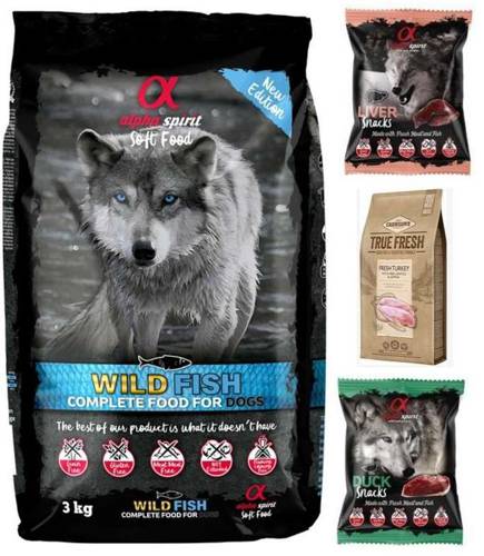 Zestaw zawiera: - 1x Alpha Spirit Wild Fish pełnoporcjowa karma 3kg- 2x Alpha Spirit przysmak w kostkach dla psa z kaczką 50g GRATIS- 1x Carnilove True Fresh Dog mix smaków 100g GRATIS Pełnoporcjowa Karma dla Psów Wild Fish to wyjątkowa karma sucha miękka. Jej skład to aż 85% świeżych ryb. Wyso…
