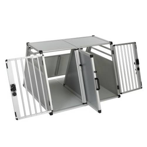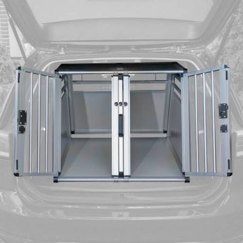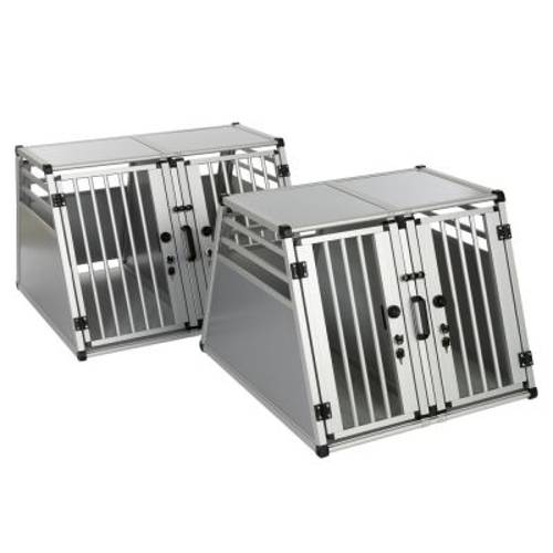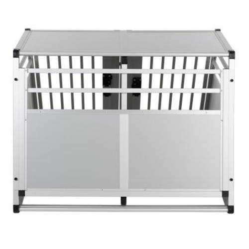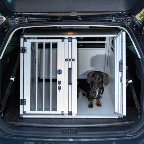 Prezentowany wysokiej jakości, aluminiowy transporter dla psów zapewnia bezpieczeństwo i komfort podczas transportu psów dużych ras w samochodzie. Transporter jest wyposażony w ściankę działową, za pomocą której w razie potrzeby można podzielić wnętrze. System ten jest pozbawiony zbędnych prowadnic na podłodze i można go w prosty sposób przymocować z przodu transportera za pomocą trzech śrub z chwytem gwiazdowym. Dzięki temu duże psy mogą wygodnie ułożyć się na całej powierzchni podłogi, a mniejsze psy można łatwo oddzielić od siebie na czas transportu.Ten wytrzymały, a zarazem lekki transporter został wykonany z solidnych profili aluminiowych i wodoodpornego, aluminiowo-plastikowego kompozytu (Aluminium-Plastic Composite Panel). Dzięki ściętemu przodowi i tyłowi doskonale pasuje do bagażnika. Gdyby w razie wypadku dostęp do bagażnika był niemożliwy, będziesz móc uwolnić swojego czworonoga przez zdejmowaną ścianę tylną. Transporter dla psów AluRide zapewnia Twojemu pupilowi najwyższy poziom bezpieczeństwa w każdej sytuacji. Oferuje także skuteczną ochronę przed słońcem i pomaga zapobiegać przegrzaniu.