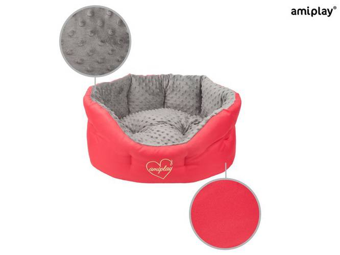 Z zewnątrz legowisko wykonane jest z bardzo trwałej tkaniny poliestrowej odpornej na uszkodzenia, wypełnione dużą ilością specjalnej mieszanki puchu syntetycznego i pianki, odpornego na odkształcenia, dzięki czemu będzie służyło psu przez długi czas. Wyposażone jest w system amiplay 2in1, co oznacza, że poducha jest dwustronna. Z jednej strony wykonana z przyjemnej w dotyku, pluszowej tkaniny, z drugiej natomiast z tkaniny poliestrowej, którą łatwo utrzymać w czystości. Poduszkę można wyprać w pralce lub ręcznie dzięki, czemu czyszczenie i odświeżenie legowiska jest bardzo łatwe.