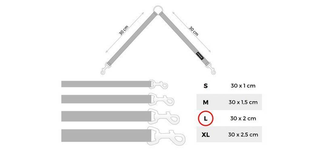 Dwójnik wykonany jest z bardzo wytrzymałej taśmy, odpornej na warunki atmosferyczne, więc świetnie sprawdzi się przy każdej pogodzie. Jest bardzo łatwy w czyszczeniu, wystarczy przetrzeć go wilgotną szmatką lub wyprać, gdy zajdzie taka potrzeba i znów jest gotowy do użycia. Mocne karabińczyki umożliwiają swobodne przypięcie oraz odpięcie, a dzięki wytrzymałości zapewniają bezpieczeństwo podczas mocniejszego szarpnięcia w czasie spaceru.