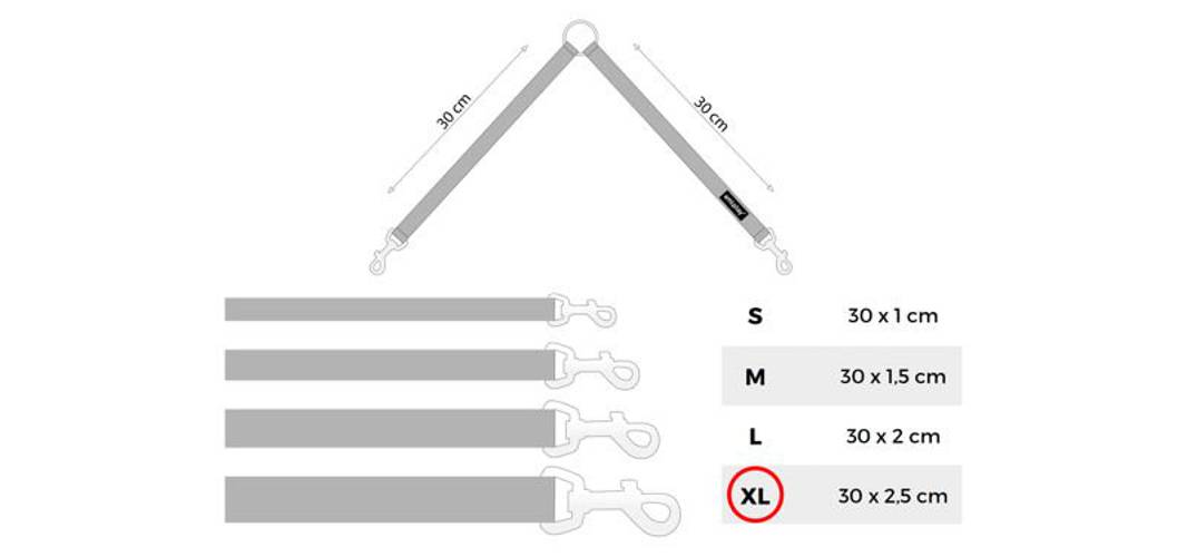 Dwójnik wykonany jest z bardzo wytrzymałej taśmy, odpornej na warunki atmosferyczne, więc świetnie sprawdzi się przy każdej pogodzie. Jest bardzo łatwy w czyszczeniu, wystarczy przetrzeć go wilgotną szmatką lub wyprać, gdy zajdzie taka potrzeba i znów jest gotowy do użycia. Mocne karabińczyki umożliwiają swobodne przypięcie oraz odpięcie, a dzięki wytrzymałości zapewniają bezpieczeństwo podczas mocniejszego szarpnięcia w czasie spaceru.