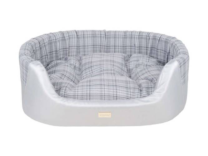Wykonana z bardzo wytrzymałej tkaniny poliestrowej z klasycznym wzorem w kratę odpornej na uszkodzenia oraz skóry syntetycznej w bardzo szykownych, metalicznych kolorach. Poducha wypełniona jest dużą ilością specjalnej, antyalergicznej mieszanki puchu syntetycznego i pianki, która zapewnia wysoki komfort oraz izolację od podłoża. Poduszkę można wyprać w pralce lub ręcznie, dzięki czemu czyszczenie i odświeżenie legowiska jest bardzo łatwe.