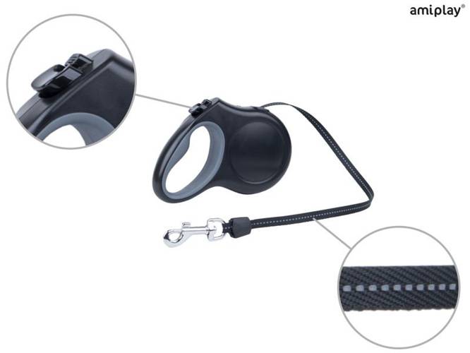 Całkowita długość taśmy to 3 m co ułatwia psu swobodne poruszanie się, bez utraty nad nim kontroli. Automatyczne zwijanie sprawia,że smycz nie wisi luźno, dzięki czemu pies się w nią nie zaplącze. Dodatkowo w taśmę wszyte są dwie odblaskowe nici, które znacznie zwiększają widoczność po zmroku.