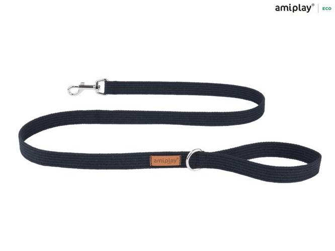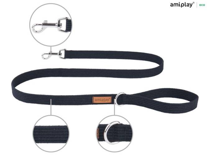 Smycz wykonana jest z bardzo wytrzymałej, a jednocześnie elastycznej ekologicznej taśmy bawełnianej produkowanej specjalnie dla firmy amiplay. Jest miękka i przyjemna w dotyku, dzięki czemu bardzo dobrze leży w dłoni, nie powodując otarć. Jest idealnej długości na miejskie spacery dla zapewniania psu bezpieczeństwa, a nam wygody. Mocny karabińczyk umożliwia swobodne przypięcie oraz odpięcie smyczy, a dzięki wytrzymałości zapewnia bezpieczeństwo podczas mocniejszego szarpnięcia w czasie spaceru. Przy uchwycie znajduje się oczko służące do wygodnego przypięcia pojemnika na woreczki. Dodatkowo smycz jest wzmocniona przy karabińczyku i uchwycie co sprawia, że jest bardziej wytrzymała na uszkodzenia.