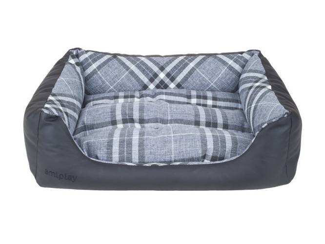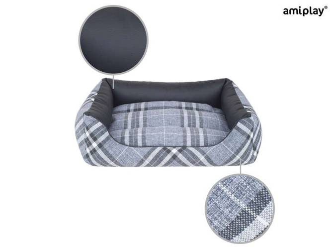 Wykonane z bardzo wytrzymałej, plecionej tkaniny z klasycznym wzorem w kratę oraz skóry syntetycznej, odpornej na uszkodzenia. Są to materiały najwyższej jakości, wykorzystywane do produkcji mebli. Poducha wypełniona jest dużą ilością specjalnej, antyalergicznej mieszanki puchu syntetycznego i pianki, która zapewnia wysoki komfort oraz izolację od podłoża. Pokrowce wszystkich elementów można wyprać w pralce lub ręcznie, dzięki czemu czyszczenie i odświeżenie legowiska jest bardzo łatwe. Poducha jest dwustronna. Z jednej strony wykonana z przyjemnej w dotyku plecionej tkaniny, z drugiej natomiast ze skóry ekologicznej, którą łatwo utrzymać w czystości. Jest to doskonałe rozwiązanie, kiedy wracamy z psem np. po spacerze w deszczu lub dla szczeniąt, którym zdarza się niekontrolowanie zabrudzić legowisko. Grube, miękkie boki legowiska stanowią doskonałe miejsce do wtulenia się pupila poszukującego bezpiecznego miejsca. Dobierając odpowiedni rozmiar legowiska warto zmierzyć powierzchnię, jaką zajmuje śpiący pies. Legowisko powinno pozwolić psu na obracanie się i ułożenie w wygodnej pozycji.