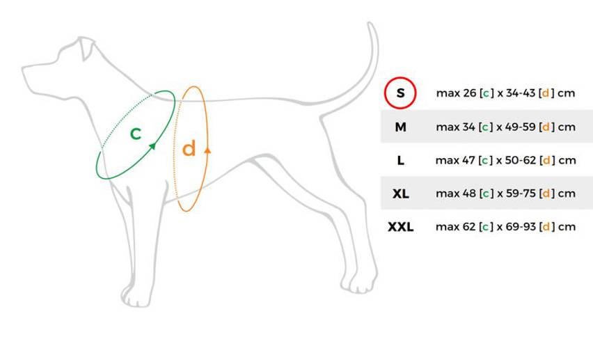 Szelki typu guard można łatwo założyć korzystając z dwóch zapięć na tylnych paskach, przekładając je jedynie przez głowę psa. Duży zakres regulacji paska piersiowego pozwala bardzo dobrze dopasować je do większości psów.
