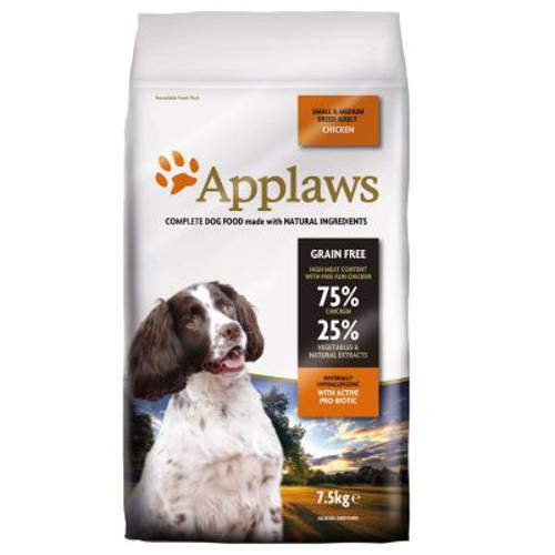Applaws Adult Small & Medium Breed o smaku kurczaka to kompletna i zbilansowana bezglutenowa karma sucha, wyprodukowana ze specjalnym uwzględnieniem potrzeb dorosłych psów ras małych i średnich. Tylko najlepsze i całkowicie naturalne składniki zostały użyte do produkcji tej karmy. Psy trawią wyjątkowo dobrze białko zwierzęce, dlatego Applaws Adult nie zawiera żadnych zbóż, a zamiast tego wyróżnia się dzięki wysokiej zawartości mięsa – 75%, owoców, warzyw oraz ziół. W ten sposób powstaje zdrowa i smaczna karma dla psów, która jest idealnie dopasowana do ich naturalnych potrzeb żywieniowych. Applaws Adult szczyci się tym, że nie zawiera żadnych barwników, sztucznych konserwantów, substancji wabiących ani wzmacniaczy smaku.Psy są z natury mięsożercami. Aby mogły zdrowo się rozwijać potrzebują dużej ilości mięsa w swojej diecie. Ich żołądek jest krótszy od żołądków krów, koni czy nawet ludzi, i jest przystosowany do przyswajania białek zwierzęcych, w przeciwieństwie do zbóż (pszenicy, kukurydzy czy jęczmienia). Dodatkowo, zawarte w karmie substancje probiotyczne troszczą się o regulowanie flory jelitowej i poprawę trawienia dorosłych psów.