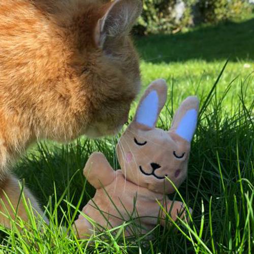 Przytulna, zabawkowa poduszeczka dla kotów, kształt królika, wypełniona korzeniem waleriany i łuskami orkiszu, przyciągające działanie, wysoka jakość z Niemiec, wyszywane elementy, ok. 16 x 9 x 6 cm