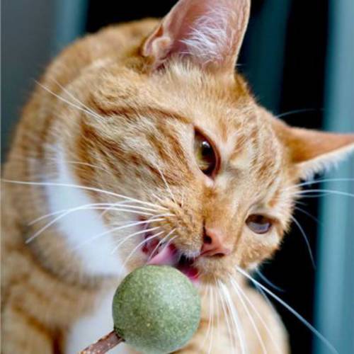 Oryginalna zabawka dla kota w kształcie lizaka, nieobrane silver vine i kulka z litej kocimiętki, magicznie przyciągająca, może działać uspokajająco i wspomagać higienę jamy ustnej, ok. 3,5 x 11 cm
