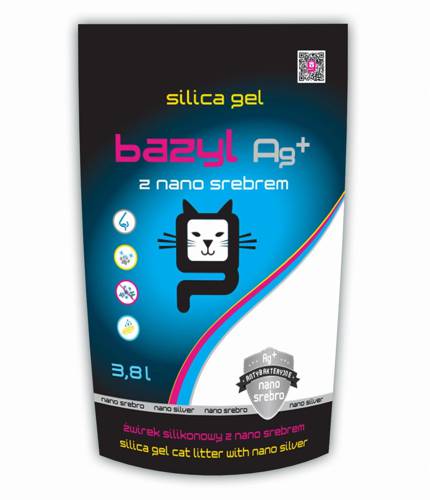Żwirek Bazyl Ag+ Silica Gel to drobny, bezzapachowy, antyseptyczny żwirek silikonowy, który dzięki dodatkowi jonów nanosrebra gwarantuje maksymalną higienę. Nanosrebro, które jako naturalny antybiotyk ma własności antyseptyczne i dezynfekujące. Jony srebra zapobiegają rozwojowi bakterii i grzybów, dzięki czemu kocia kuweta jest higienicznie czysta. Nanosrebro dodatkowo całkowicie neutralizuje i usuwa nieprzyjemny zapach.