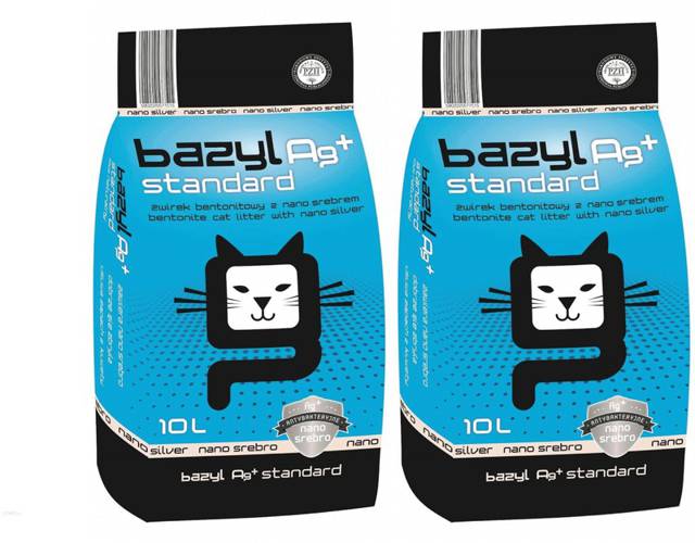 Żwirek Bazyl Ag+ Standard to drobny, bezzapachowy żwirek z najwyższej jakości bentonitu (zawartość montmorylonitu powyżej 80%) wzbogacony o dobroczynne nanosrebro, które jako naturalny antybiotyk ma własności antyseptyczne i dezynfekujące. Jony nanosrebra działają permanentnie i zapobiegają rozwojowi bakterii i grzybów.