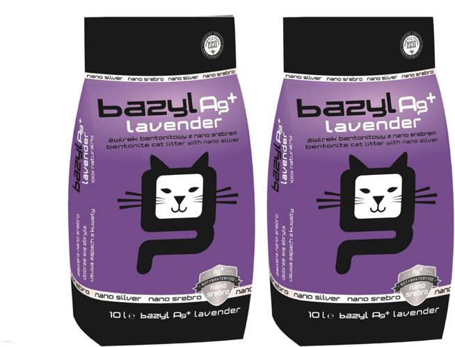 Żwirek Bazyl Ag+ Lavender to drobny żwirek z najwyższej jakości bentonitu, o zapachu lawendy (zawartość montmorylonitu powyżej 80%) wzbogacony o dobroczynne nanosrebro, które jako naturalny antybiotyk ma własności antyseptyczne i dezynfekujące. Jony nanosrebra działają permanentnie i zapobiegają rozwojowi bakterii i grzybów.
