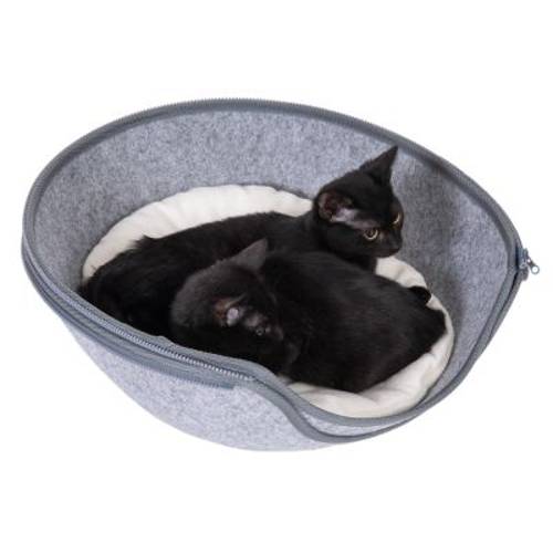 Przestronna budka dla kota, ze sztucznego filcu, otwierana suwakiem, także jako legowisko, z wyjmowaną przytulną poduszką, chroni przed przeciągiem, kolor: szaryKto się tutaj chowa? Dwie połówki z odpornego na zniekształcenia sztucznego filcu tworzą przestronną, a zarazem przytulną budkę, w której …