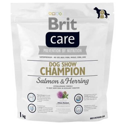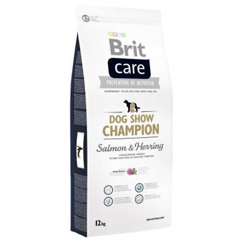 Ta karma opracowana została specjalnie z myślą o psach wystawowych, cechuje ją skrupulatny dobór surowców i składników witalnych. Hipoalergiczna receptura karmy Brit Care Dog Show Champion nie zawiera zbóż, soi i kukurydzy, przez co jest wyjątkowo lekkostrawna. Wysoka zawartość łososia (35%), śledzia (10%) oraz ryżu (32%) dostarczy do organizmu Twojego psa wysokojakościowych, lekkostrawnych białek. Kwasy tłuszczowe omega-3 oraz kwas foliowy i witamina B redukują stres i działają rozluźniająco podczas pokazu. Kwasy tłuszczowe omega-6 wspierają kondycję sierści i nadają jej blasku.Jednocześnie prebiotyki MOS i FOS przyczyniają się do zrównoważenia flory żołądka i jelit i polepszają wchłanianie wszelkich wartościowych substancji. Zawarty w recepturze karmy olej z łososia bogaty jest w wielokrotnie nienasycone kwasy tłuszczowe, m.in. kwasy omega-3, oddziałujące pozytywnie na procesy trawienne, kondycje futra i zdrowie skóry.Witamina C ochrania komórki i wspiera siły odpornościowe organizmu. Recepturę karmy wzbogacono także o substancje czynne: chondroitynę i glukozaminę, które dbają o mocne i zdrowe stawy i chrząstki stawowe. Ekstrakt z jukki pobudza metabolizm, a L-karnityna pomaga w redukcji pokładów tłuszczu, przekształcając go w energię. Wszystkie karmy marki Brit są lekkostrawne i wysokowartościowe. Prawidłowe żywienie to podstawa w drodze do zwycięstwa!