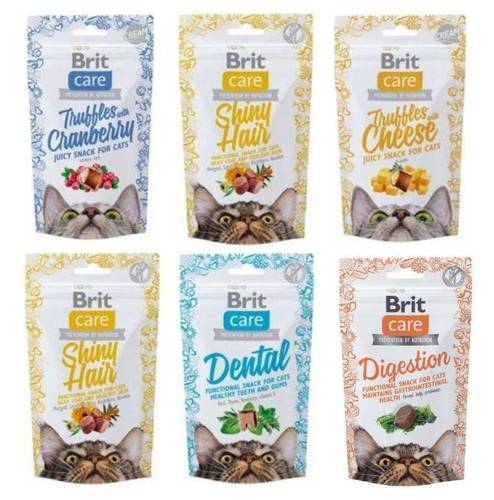 Zestaw zawiera:1x Brit Care Functional Dental 50g2x Brit Care Functional Shiny Hair 50g1x Brit Care Thuffles With Cheese 50g1x Brit Care Cat Snack Digestion 50g1x Brit Care Thuffles With Cranberry 50g Brit Care Functional Dental - Funkcjonalna, bezzbożowa przekąska wspomagająca zdrowie zębów i dzią…