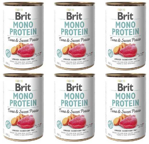 Brit Mono Protein Tuna & Sweet Potato 6x400g Brit Mono Protein Tuna & Sweet Potato to pełnoporcjowa karma wilgotna z tuńczykiem i słodkimi ziemniakami dla psów wszystkich ras. Odpowiednia dla psów z wrażliwym przewodem pokarmowym, alergią i nietolerancją pokarmową Bez soi. Bez glutenu. Bez…