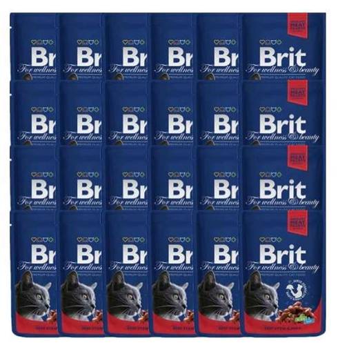Brit Premium Adult Gulasz wołowy i Groszek 24x100g Pełnowartościowa karma dla kotów klasy premium. Saszetki Brit Premium urozmaicają codzienną dietę Twojego kota w zgodzie z jego naturalnymi potrzebami. Atrakcyjny zapach będzie przyciągał i kusił Twojego kota, który radośnie odwdzięczy się mru…