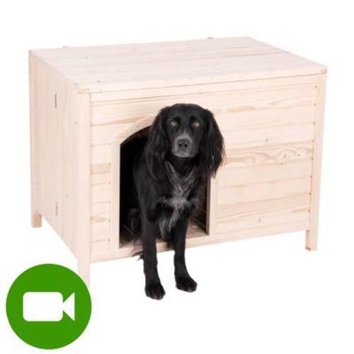 Składana buda dla psa, z surowego drewna ze zrównoważonej gospodarki leśnej, z możliwością indywidualnej aranżacji, z osobną wkładką do drzwi, zmontowana, dostępna w 3 rozmiarach
