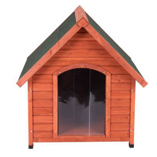 Buda dla psa z dwuspadowym dachem, wewnętrzną izolacją styropianową i drzwiami z tworzywa sztucznego, całoroczna ochrona przed chłodem i upałem; wykonana z ekologicznego drewna