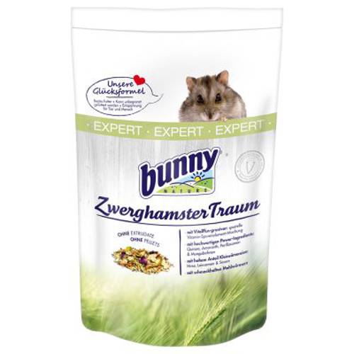 Zgodne z dobrostanem gatunkowym pożywienie dla chomików karłowatych, bez granulatu ani ekstrusdatów, zbalansowana receptura "super składników", wysoka zawartość drobnych ziaren i pysznego mączniki młynarkaBunny Expert Marzenie chomika karłowatego bez ekstrudatów i granulek będzie odpowiednim pożywi…
