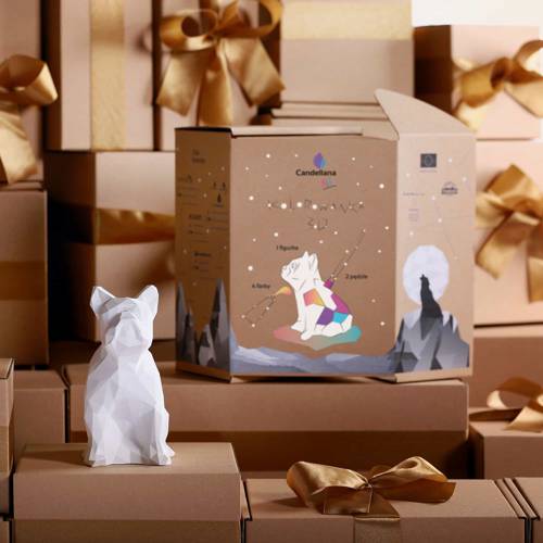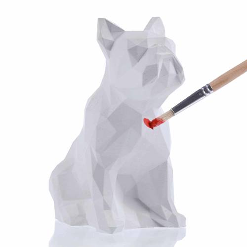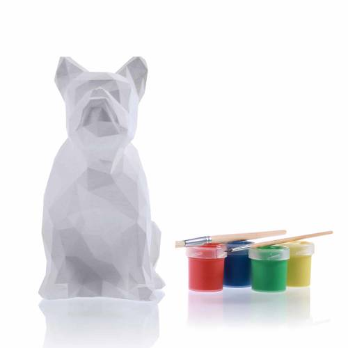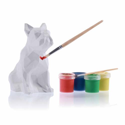 Candellana Kids Kolorowanka gipsowa 3D Bulldog Low Poly to zestaw, który zawiera gipsową figurkę buldoga francuskiego, 2 pędzle oraz 4 farby.
