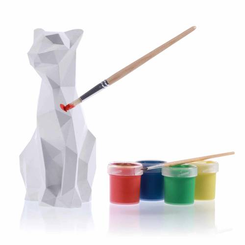 Candellana Kids Kolorowanka gipsowa 3D Cat Low Poly to zestaw, który zawiera gipsową figurkę kota, 2 pędzle oraz 4 farby.