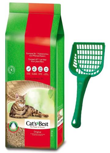 W ten sposób trwale wiązane są zapachy, dlatego też żwirek może pozostawać w kuwecie nawet do 7 tygodni. Cat’s Best Original działa najlepiej, gdy wyjmowane są z niego na bieżąco zwarte odchody, a powstałe po kociej wizycie bryłki usuwane są regularnie do śmieci biologicznych lub spłukiwane w toalecie – najlepiej robić to oryginalną łopatką Cat’s Best, której sito dopasowane jest do wielkości cząstek żwirku. To oszczędza czas, koszty i zapewnia Twemu kotu odpowiednią higienę i komfort.