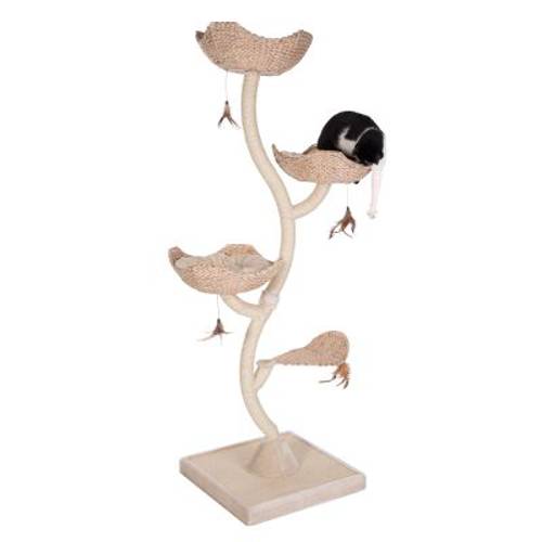 Drapak dla kotów o wadze do 6 kg, w kształcie kwiatu z owiniętymi sizalem słupkami, masywna podstawa z matą do drapania, 3 legowiska plecione z hiacynta wodnego, dwukolorowe poduszki. Kolor: kremowy
