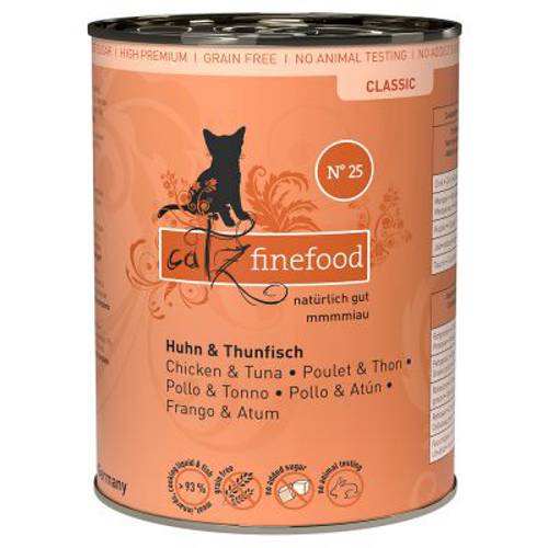 Witalność i zdrowie kota zależy zasadniczo od jedzenia, którym się żywi. Produkty catz finefood to dopasowane do potrzeb, zbilansowane i naturalne karmy dla kotów. Poszczególne receptury są wzorowane na naturalnym pożywieniu, dlatego zawierają najważniejsze substancje odżywcze i białka, które sama natura przewidziała dla kotów. Z tego powodu karma jest wolna od zbóż, będących ciężkostrawnym i nieprzyswajalnym składnikiem w kociej diecie.W karmie znajdują się wyłącznie najwyższej jakości mięso i wnętrzności z niemieckich gospodarstw rolnych oraz ryba z wolnych i zrównoważonych połowów. Cenne, świeże składniki po szczegółowym sprawdzeniu i kontroli weterynaryjnej wejdą w skład catz finefood. Zapewnia to maksymalna kontrola jakości i bezpieczeństwa. Podczas starannego gotowania na parze wszystkie substancje odżywcze oraz cenne kwasy tłuszczowe zostają niemal całkowicie zachowane. Produkcja karmy: wyłącznie w Niemczech.