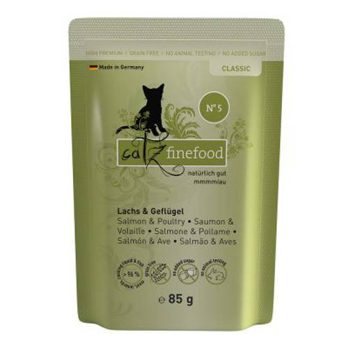 Witalność i zdrowie kota zależy zasadniczo od jedzenia, którym się żywi. Produkty catz finefood to dopasowane do potrzeb, zbilansowane i naturalne karmy dla kotów. Poszczególne receptury są wzorowane na naturalnym pożywieniu, dlatego zawierają najważniejsze substancje odżywcze i białka, które sama natura przewidziała dla kotów. Z tego powodu karma jest wolna od zbóż, będących ciężkostrawnym i nieprzyswajalnym składnikiem w kociej diecie.W karmie znajdują się wyłącznie najwyższej jakości mięso i wnętrzności z niemieckich gospodarstw rolnych oraz ryba z wolnych i zrównoważonych połowów. Cenne, świeże składniki po szczegółowym sprawdzeniu i kontroli weterynaryjnej wejdą w skład catz finefood. Zapewnia to maksymalna kontrola jakości i bezpieczeństwa. Podczas starannego gotowania na parze wszystkie substancje odżywcze oraz cenne kwasy tłuszczowe zostają niemal całkowicie zachowane. Produkcja karmy: wyłącznie w Niemczech.