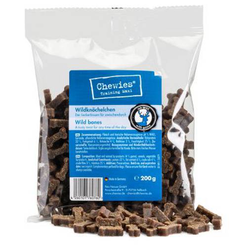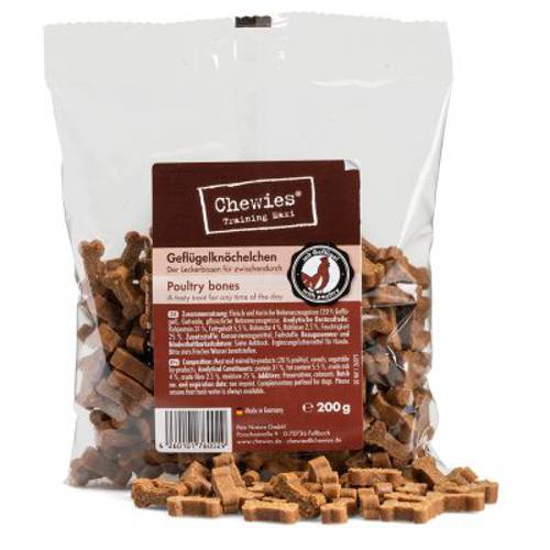 Te malutkie pyszności w kształcie kosteczek zostały opracowane we współpracy z trenerami i szkółkami dla psów. Przez wysoką zawartość mięsa cieszą się bardzo dobrą akceptacją i doskonale sprawdzą się podczas treningu. Kosteczki Chewies posiadają rozmiar ok. 2 cm, dzięki czemu można je podawać psu zarówno w całości, jak i rozdrobnione. Miękka konsystencja sprawia, że małe kosteczki można bez problemu połamać na mniejsze kawałki.
