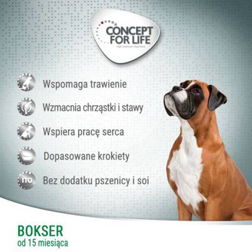 Bokser to pies żywy i ciekawski. Nawet w wieku dorosłym zachowuje swój figlarny charakter i uwielbia się bawić.Atletyczna budowa i aktywna natura to ważne aspekty, które należy uwzględnić w diecie psa. Szczególną rolę odgrywa zdrowa praca serca oraz wsparcie chrząstek i stawów. Concept for Life Boxer Adult został opracowany specjalnie z myślą o tych potrzebach żywieniowych i zapewnia optymalną, wszechstronną opiekę i witalność.