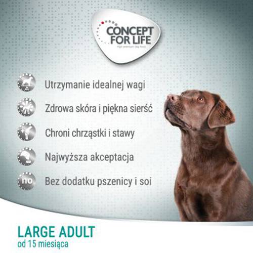 Każdy pies potrzebuje diety, która jest odpowiednio dopasowana do wielkości i potrzeb związanych z jego rasą. Psy dużych ras nie tylko potrzebują większej ilości pokarmu, lecz również jego odpowiedniego rodzaju. W związku z wielkością i wagą układ ruchu u dużych psów narażony jest na większe przeciążenia. Dlatego składniki odżywcze chroniące stawy są niezbędnym elementem diety. Wysokowartościowe białka mają z kolei znaczenie w kwestii utrzymania optymalnej wagi ciała.Concept for Life Large Adult gwarantuje zbilansowane proporcje substancji odżywczych, które przyczyniają się do zrównoważonego rozwoju psów dużych ras.
