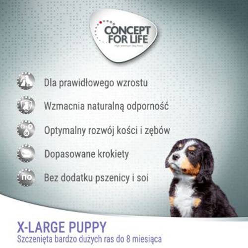 Wysokojakościowa karma Concept for Life X-Large Puppy została opracowana na podstawie badań naukowych specjalnie dla szczeniąt oraz suk szczennych i karmiących ras olbrzymich: