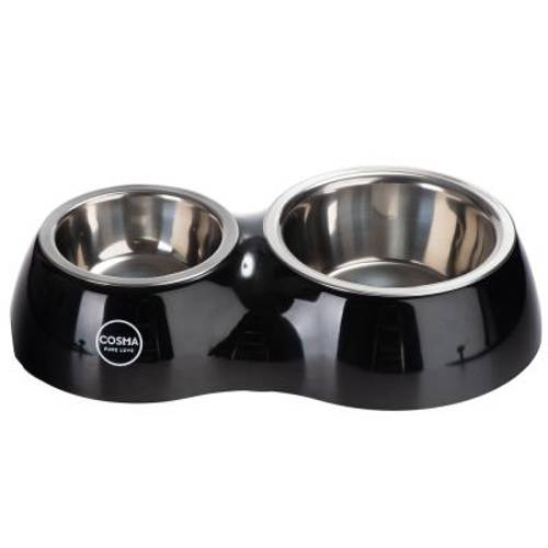 Nowoczesna podwójna miska dla kotów, z melaminy, 2 wkłady ze stali nierdzewnej w różnych rozmiarach, stylowe wzornictwo z dyskretnym logo Cosma, można myć w zmywarce, antypoślizgowa, kolor: czarny