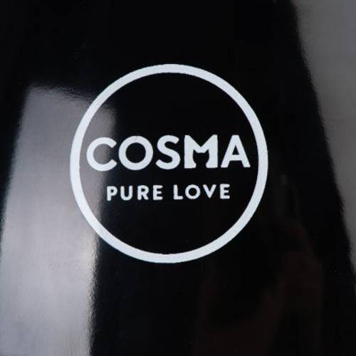 • Modne wzornictwo z okrągłym nadrukiem logo i sloganem „Cosma pure Love“