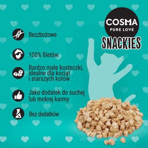 Liofilizowany przysmak Cosma Snackies Minis, bezzbożowe mini kosteczki, 100% czystego mięsa i ryby - naturalne, bez dodatków, idealne jako dodatek do karmy. Teraz w pakiecie w niskiej cenie!