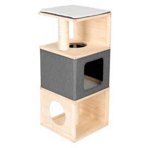 W szczególności kotom niewychodzącym należy zapewnić odpowiednią dawkę zabawy i wspinaczki oraz miejsce do drapania w mieszkaniu. Prezentowany domek dla kota Cubist to doskonałe rozwiązanie. Stabilna drewniana konstrukcja zmieści się w niemal każdym kącie, zapewniając Twojemu kotu możliwość zabawy na czterech poziomach.Ta trzypiętrowa wieża dla kota jest stabilna i wytrzymała: jest w stanie wytrzymać nawet najdziksze zabawy. Na samej górze znajduje się wygodna platforma widokowa, z której Twój pupil może obserwować otoczenie. Domek wykonany z odpornego na zniekształcenia materiału świetnie nadaje się jako kryjówka lub miejsce do odpoczynku. Przez otwór w dachu Twój kot może przedostać się na wyższy poziom. Oprócz tego na dwóch piętrach znajdują się słupki do drapania owinięte naturalnym sizalem, na których Twój ulubieniec może ostrzyć pazury. Wysoki komfort leżenia zapewniają zawarte w komplecie poduszki wypełnione tworzywem piankowym.