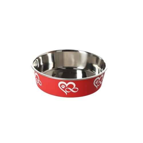 Na zewnątrz pokryta kolorową osłoną z tworzywa sztucznego w ciekawym wzorem serca, nieskończoności i psiej łapki. Połączenie błyszczącej stali i kolorowej obudowy, powoduje, że miska prezentuje się bardzo ładnie.